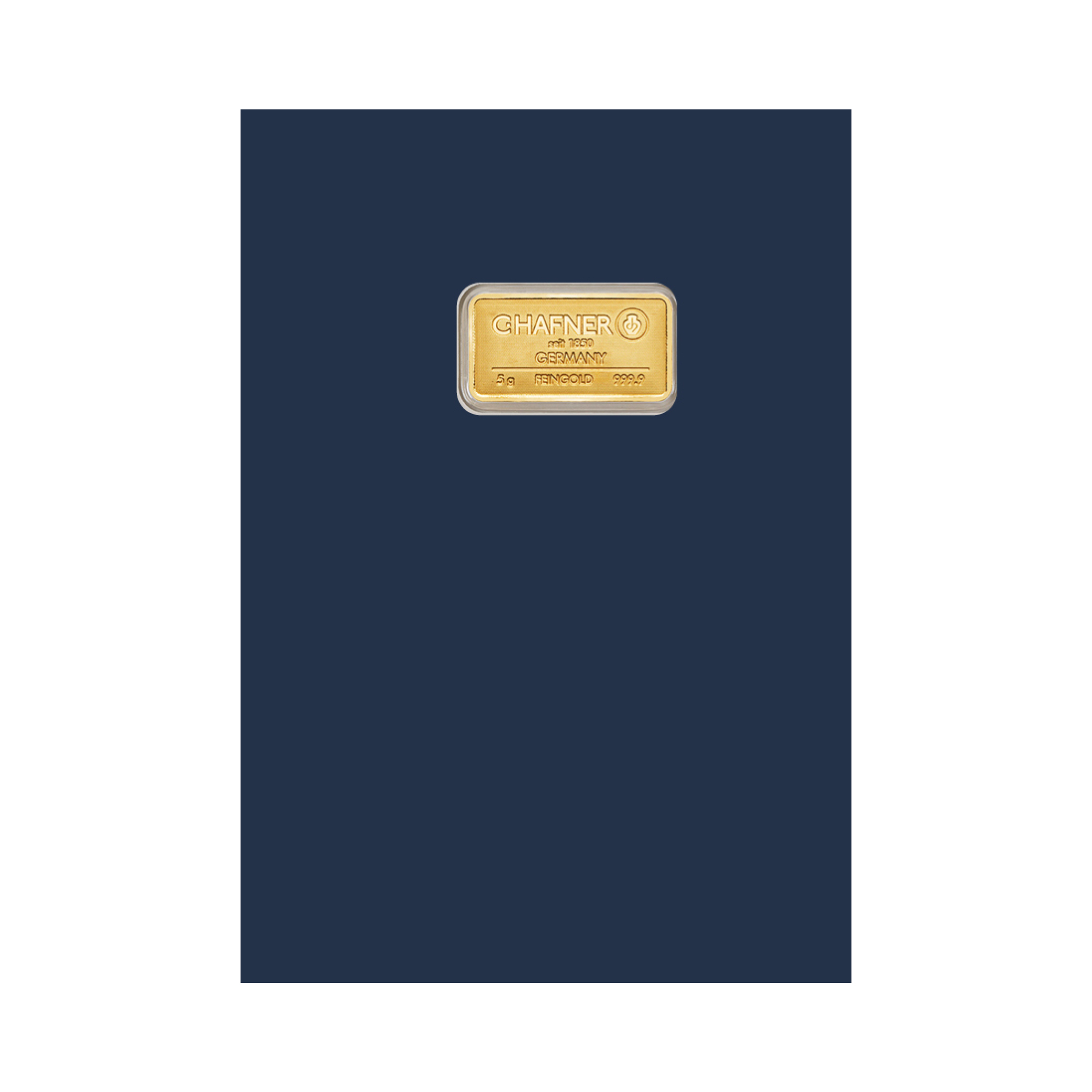 Guldtacka av högsta finhalt 999,9 med en tillhörande sleeve med ett blått motiv.