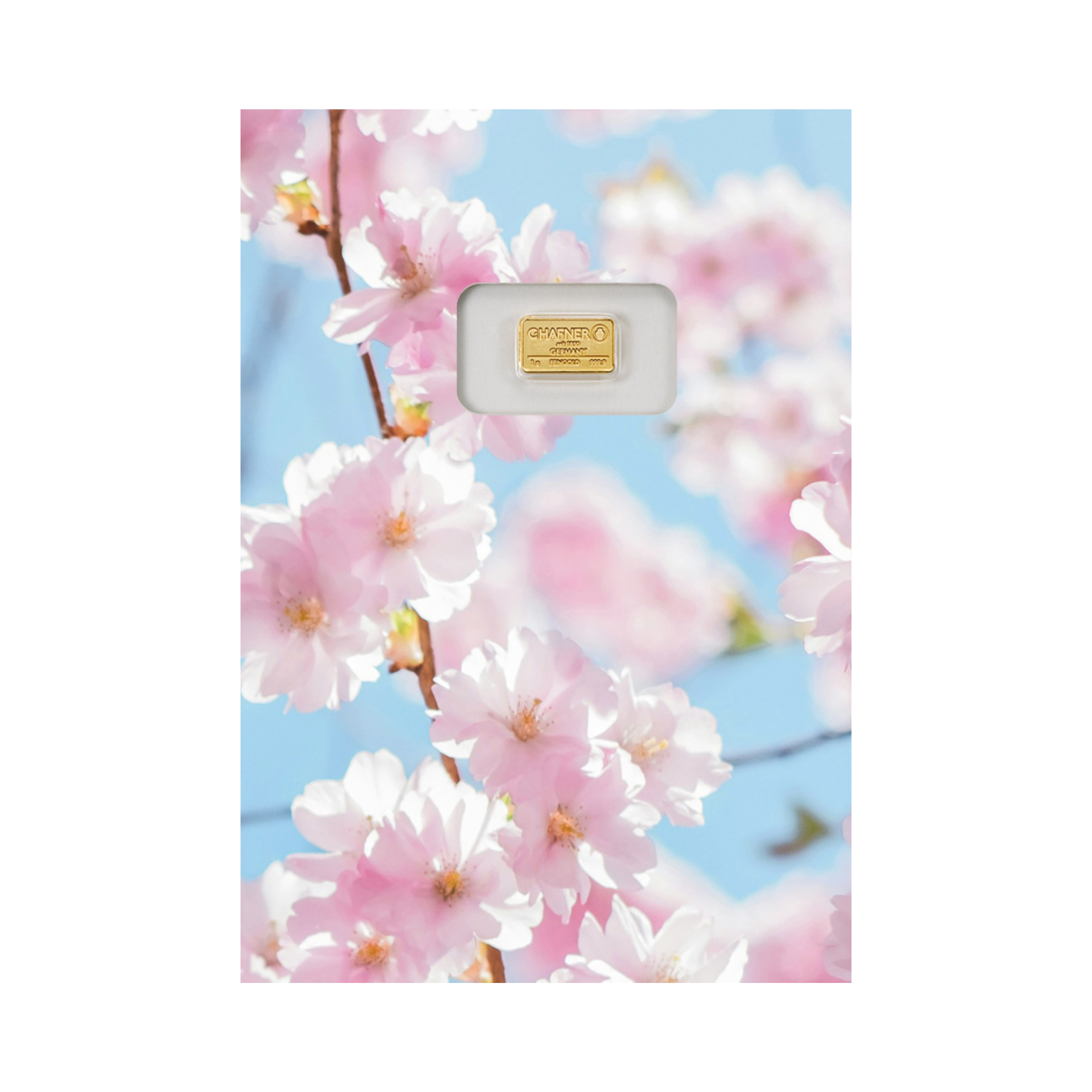 Guldtacka av högsta finhalt 999,9 med en tillhörande sleeve med ett motiv av körsbärsblommor.
